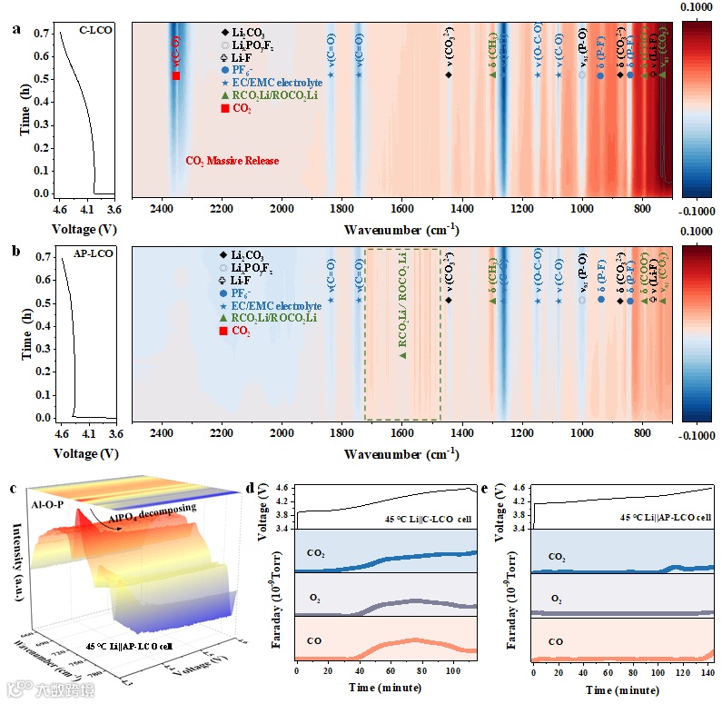 其中,C2HO-对应于由溶剂分解引起的有机聚合物,在AP-LCO的CEI中分布较少,表明溶剂的分解受到了抑制。LiAlF4-在AP-LCO的整个CEI中明显可见,清楚地表明Li3AlF6的生成伴随着AlPO4的分解,这可以通过原位IR已经确认。与C-LCO相比,AP-LCO表面形成坚固CEI的原因如下:首先,表面涂层隔离了高度氧化性的Co4+/Oα-(α<2)与溶剂的直接接触,减少了CEI中的有机物种类。其次,在循环过程中,AlPO4向Li3AlF6/Li3PO4的转化促进了整个CEI中Li+导电性LiAlF4-种类的形成,从而加速了Li+传输动力学。第三,AlPO4/Li3PO4沉积物为富含无机成分的CEI提供了足够的磷酸盐来源,从而减少了PF6-阴离子的水解。循环后的AP-LCO表面的CEI表现出优异的特性,包括减少的HF腐蚀、致密且均匀的结构、低Li+传输阻抗、高热稳定性等。