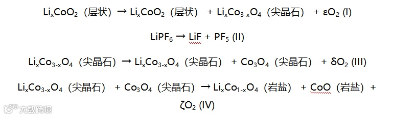 为了揭示优化CEI对提高AP-LCO热稳定性的有益作用,将Li||LCO电池充电至4.6 V,拆解并将活性LCO从铝电流收集器上刮下,然后在N2气氛下进行热重分析。TGA结果显示存在四个代表热诱导分解反应的峰值I到IV,详细反应如下: