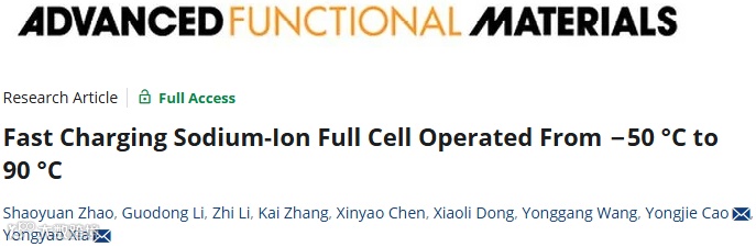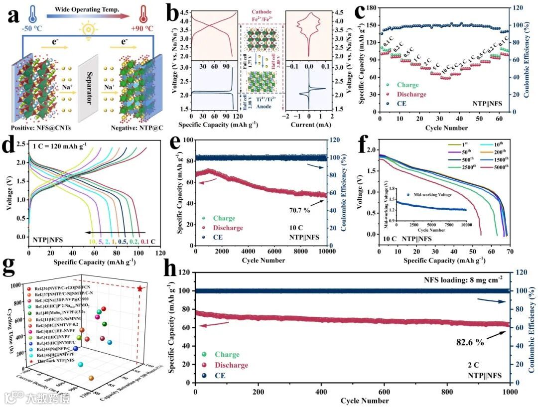 近日,来自复旦大学的夏永姚团队,在国际知名期刊Advanced Functional Materials上发表题为“Fast Charging Sodium-Ion Full Cell Operated From −50 °C to 90 °C”的研究论文。该论文通过Na2.4Fe1.8(SO4)3(NFS)正极和NaTi2(PO4)3(NTP)负极以及一款商业化酯基电解液构建了钠离子全电池体系(SIFCs),电池能够在10 C高倍率下稳定循环10000圈并保持70.7%的可逆容量,并且能够在-50至90 °C的宽温度范围内安全运行。
