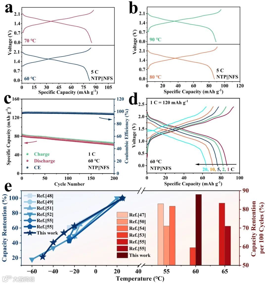 图5. a) 在60 ℃、70 ℃和b) 80 ℃、90 ℃下,NTP||NFS全电池在5 C电流密度下的恒流充放电曲线。c) 60 ℃下,NTP||NFS全电池在1 C下的循环稳定性。d) 60 ℃下,NTP||NFS全电池在不同电流密度下的恒流充放电曲线。e) 与其他报道的钠离子全电池相比,NTP||NFS全电池在不同温度下的容量保持率。