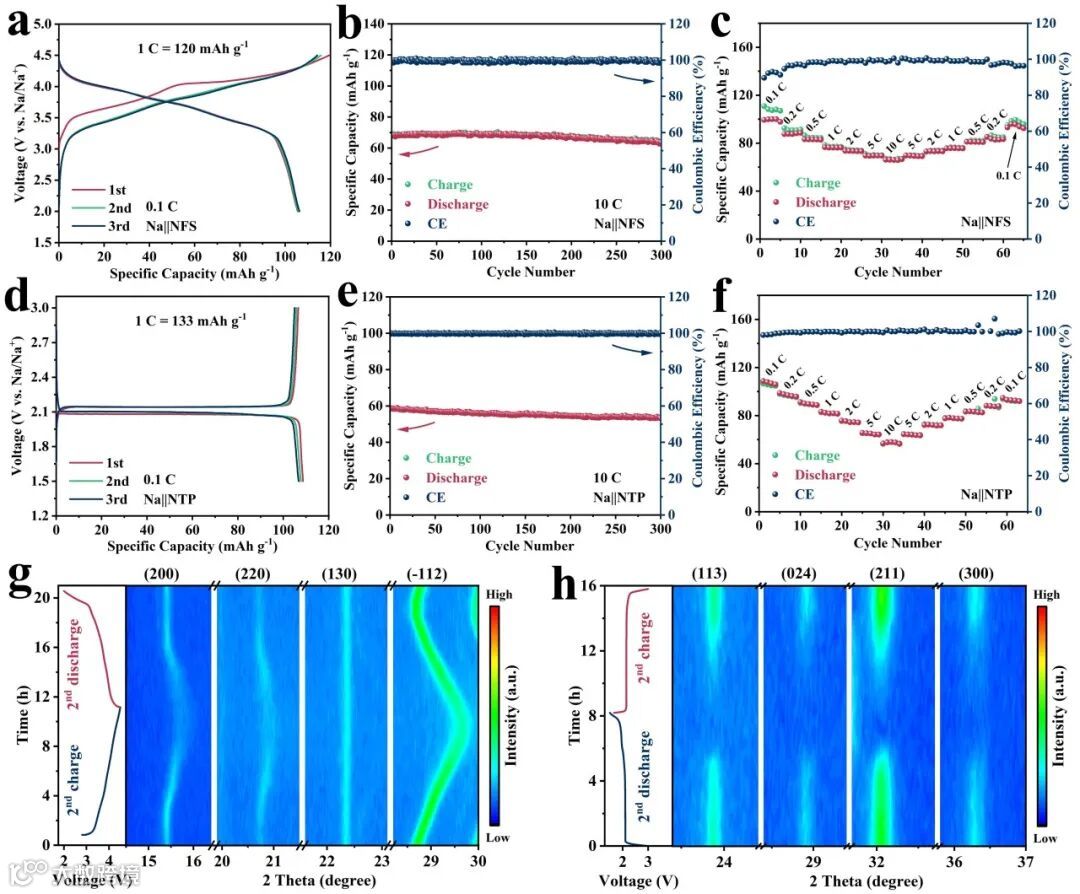 图1. a) Na||NFS和d) Na||NTP半电池在0.1 C倍率下的恒流充放电曲线。b) Na||NFS和e) Na||NTP半电池在10 C倍率下的循环稳定性。c) Na||NFS和f) Na||NTP半电池0.1C到10C的倍率性能。g) NFS和h) NTP的原位XRD图以及相应的电压-时间曲线。