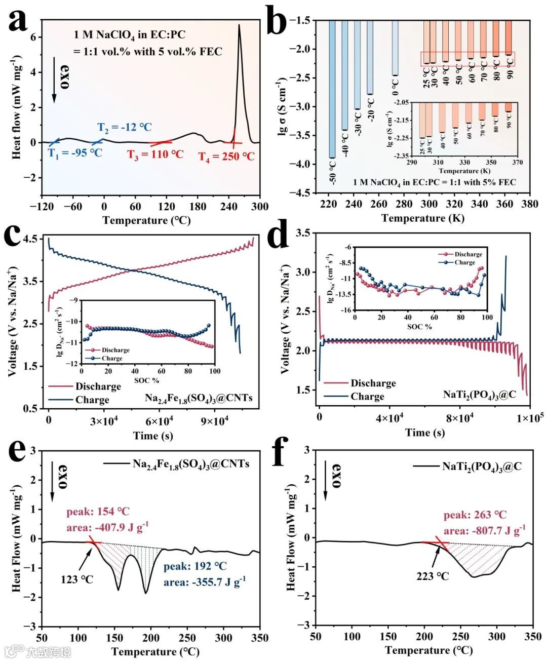 图2. a) 电解液(1 mol L−1 NaClO4溶解在EC/PC=1:1中,同时含有5% FEC)的DSC测试曲线。b) 电解液在不同温度下的离子电导率。c) NFS和d) NTP材料在充放电过程中的GITT曲线。插图是从GITT曲线计算出的钠离子化学扩散系数与SOC之间的关系(0.1 C循环一圈后)。e) NFS(4.5 V)和f) NTP(1.5 V)的DSC测试曲线。