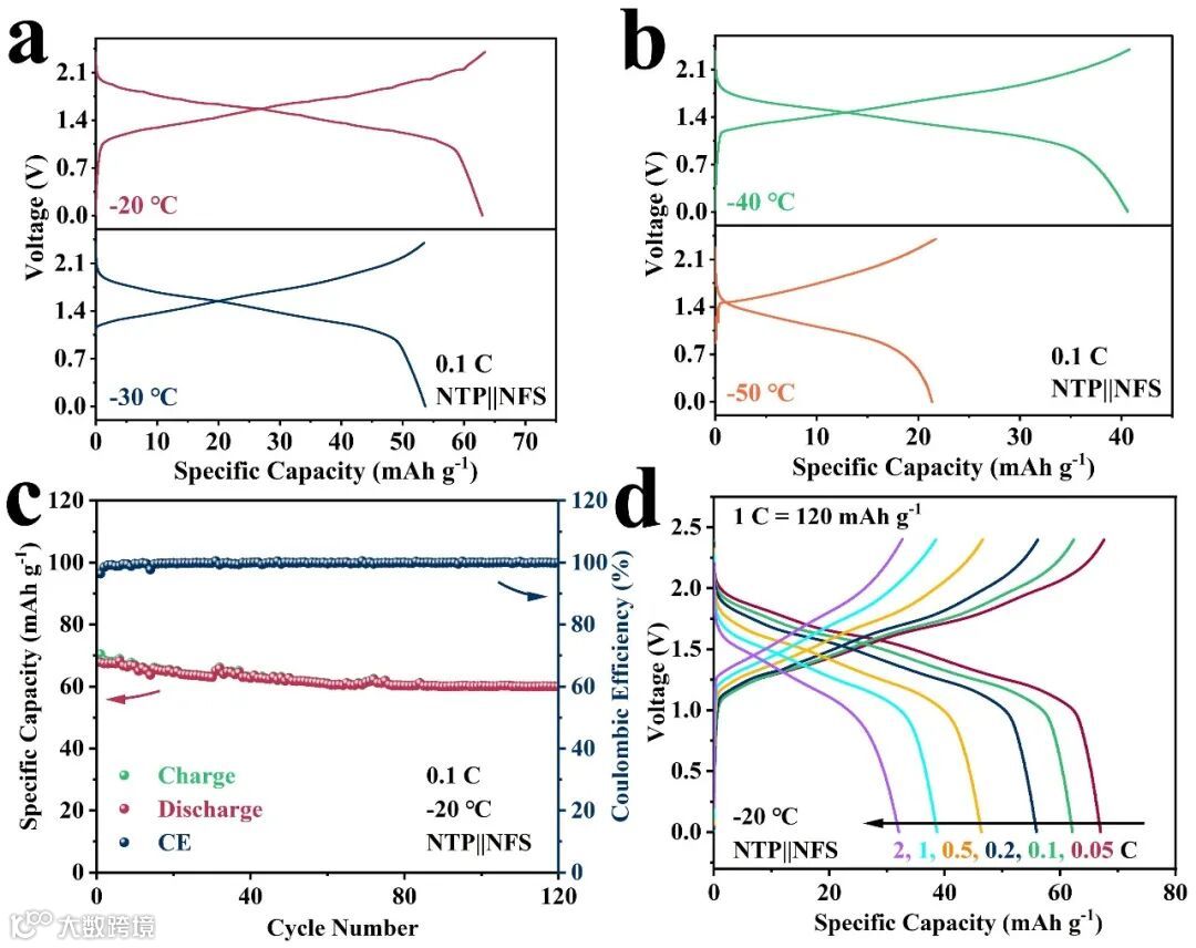 图4. a) 在-20 ℃、-30 ℃和b) -40 ℃、-50 ℃下,NTP||NFS全电池在0.1 C电流密度下的恒流充放电曲线。c) -20 ℃下,NTP||NFS全电池在0.1 C下的循环稳定性。d) -20 ℃下,NTP||NFS全电池在不同电流密度下的恒流充放电曲线。