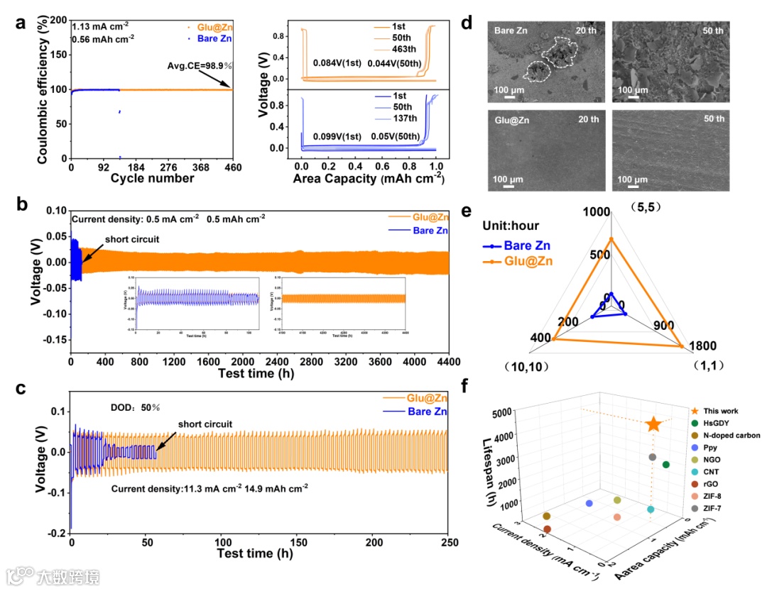 图5. a) Zn||Cu电池CE图。裸Zn和Glu@Zn对称电池的循环性能:b) 0.5 mA cm-2、0.5 mAh cm-2,c) 50% DOD。d) 循环后裸Zn和Glu@Zn的SEM图。e) 不同电流密度下裸锌和Glu@Zn电极对称电池的循环性能比较。f) 本工作与其他工作的比较。
