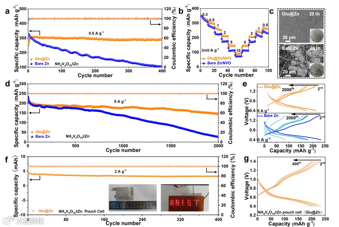 图6. a) 不同阳极Zn||NVO电池循环性能和b) 倍率性能。c) 在0.5 A g-1下全电池20次循环后的Zn电极的SEM图像。d) 全电池在5 A g-1下的循环性能。e) 所选周期对应的充放电曲线。f) Glu@Zn||NVO软包电池在2 A g-1下的循环性能,以及相应的数码照片、软包电池工作照片。g) 软包电池对应的充放电曲线。