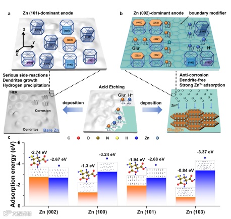 图1. a) 液相沉积法处理谷氨酸制备的双界面调制Zn金属阳极示意图。b) Glu-和H+在Zn (002)和(100)、(101)、(103)晶面上的吸附能。