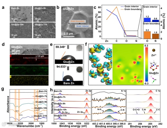 图3. a) 电极的SEM图像。b) SEM图像,c) 点扫描对应的能谱图,d) Glu@Zn的截面及其能谱图。e) 裸Zn与Glu@Zn的接触角。f) Gln@Zn的电荷密度分布。g) FTIR光谱,h) 各电极的高分辨率XPS光谱。