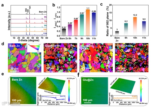 图2. a) XRD图,b) I(002)/I(101)强度比,c) 基于图像识别的002晶面对应比,d) 电极的EBSD图。e) 裸Zn, f) Glu@Zn阳极的LSCM图。