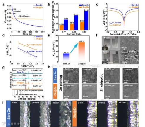 图4. a) 锌阳极的CAs。b) 不同电流下对称电池成核过电位的比较。c) Zn阳极对应的Tafel曲线和d) Arrhenius图和活化能。e) EDL值。f) 裸锌和Glu@Zn两电极体系循环20次后的数码照片和SEM图像。g) 循环后的XRD图。h) 沉积/剥离工艺演变。i) 5 mA时Zn电极沉积行为的原位光学显微镜图像。