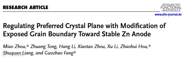 近日,湖南理工学院侯朝辉教授&中南大学方国赵教授团队在国际顶级期刊Advanced Functional Materials上发表题为“Regulating preferred crystal plane with modification of exposed grain boundary towards stable Zn anode”的文章。本工作成功开发了一种新型稳定锌负极材料(取名Glu@Zn),通过谷氨酸刻蚀处理,实现了(002)晶面的优先暴露和晶界有效修饰,从而显著提升了锌负极的稳定性和可逆性。该Glu@Zn负极通过优化晶体取向,使其(002)晶面暴露,调节表面能,从而在电化学过程中展现出优异的Zn2+均匀沉积特性。同时将暴露的晶界进行修饰,减少了锌负极的腐蚀和析氢反应。