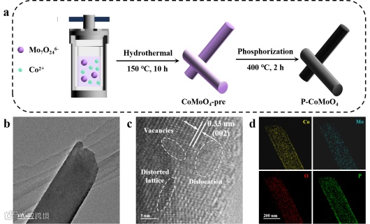 图2. (a)P-CoMoO4的合成示意图;(b)TEM图像;(c)HRTEM图像;(d)对应的Co、Mo、O和P的元素映射图。