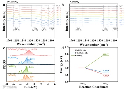 图6. (a)P-CoMoO4和(b)CoMoO4催化剂在0.5 M Na2SO4和50 mM NaNO3下NO3RR的原位红外光谱;(c)P-CoMoO4/Co(OH)2、P-CoMoO4、Co(OH)2和CoMoO4中的PDOS;(d)P-CoMoO4表面不同位点和Co(OH)2表面的吸附能。