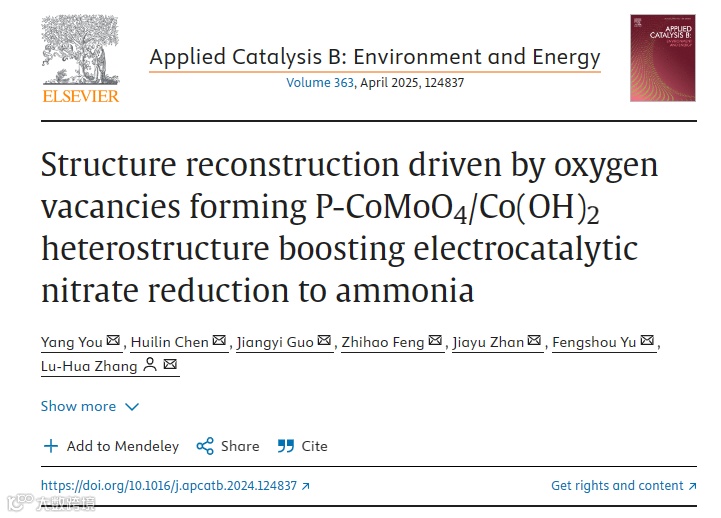 近日,来自河北工业大学的张鲁华教授,在国际知名期刊Applied Catalysis B: Environment and Energy上发表题为“Structure Reconstruction Driven by Oxygen Vacancies Forming P-CoMoO4/Co(OH)2 Heterostructure Boosting Electrocatalytic Nitrate Reduction to Ammonia”的原创性文章。该工作通过P的掺杂在催化剂中引入氧空位,氧空位的存在诱导催化剂在电催化过程中发生重构形成异质结,从而提高NO3RR的性能。