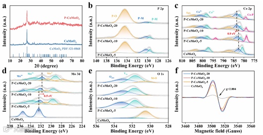 图3. (a)CoMoO4和P-CoMoO4-x的XRD;CoMoO4和P-CoMoO4-x的(b)P 2p;(c)Co 2p;(d)Mo 3d和(e)O 1s的XPS光谱;(f)CoMoO4和P-CoMoO4-x的EPR谱图。