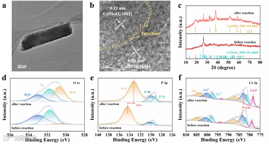 图5. NO3RR后P-CoMoO4的(a)TME和(b)HRTEM图像;(c)NO3RR前后P-CoMoO4的XRD谱图比较;P-CoMoO4前后的(d)O 1s;(e)P 2p和(f)Co 2p的XPS光谱。