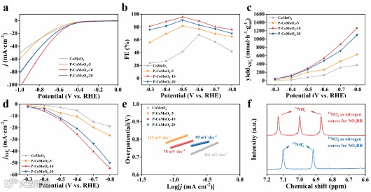 P掺杂后的催化剂在常规H-型电解池中表现出优于未掺杂P的催化剂。其中,P-CoMoO4-10催化剂表现出最优的电催化NO3RR性能,在-0.5 V vs. RHE电位下NH4+的法拉第效率达到96.7%,最大产率达到1264.6 mmol·h-1·gcat-1。