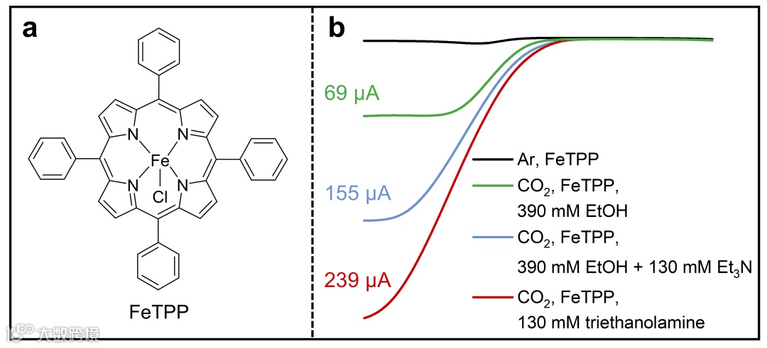 图1(a)FeTPP的分子结构。(b)加入不同质子源后FeTPP的CO2RR活性示意图。