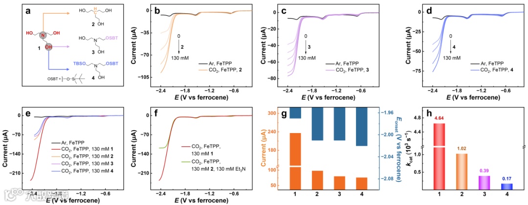 图4(a)2、3和4的分子结构。二氧化碳条件下0.5 mM FeTPP随(b)2、(c)3和(d)4浓度增加的线性循环伏安曲线图。(e)二氧化碳条件下加入130 mM 1、2、3和4时0.5 mM FeTPP的线性循环伏安曲线对比图。(f)130 mM质子源1与130 mM质子源2和130 mM Et3N同时存在时0.5 mM FeTPP线性循环伏安曲线对比图。(g)加入130 mM 1、2、3和4时催化电流与起峰电位的对比图。(h)0.5 mM FeTPP加入1、2、3和4之后的催化速率常数对比图。