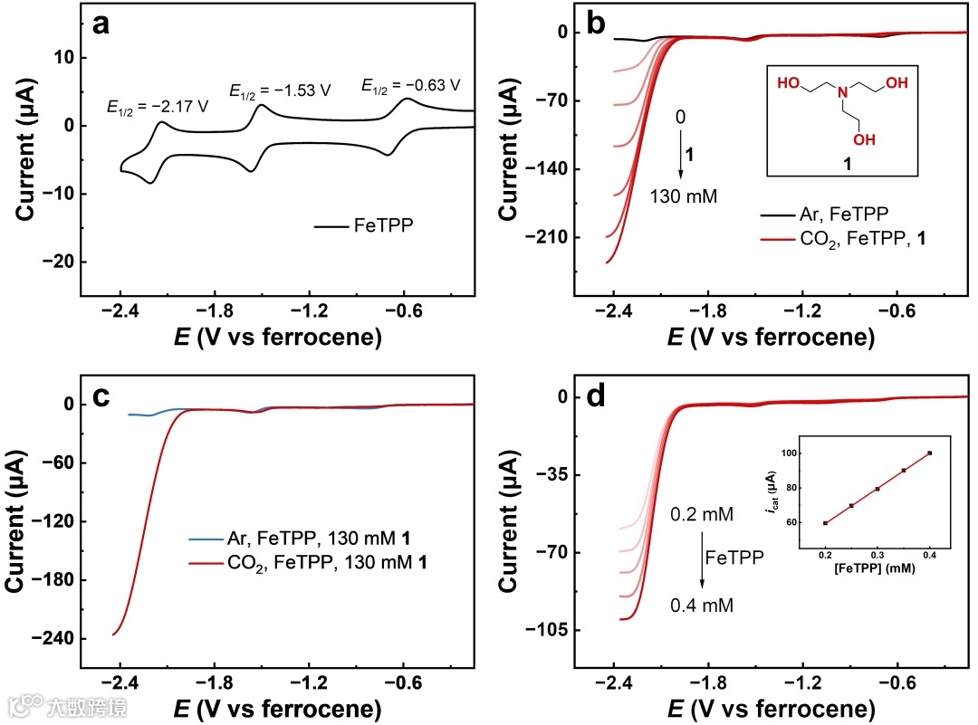 图2(a)氩气条件下0.5 mM FeTPP在DMF中的循环伏安曲线。(b)二氧化碳条件下0.5 mM FeTPP随1浓度增加的线性循环伏安曲线图。(c)氩气和二氧化碳条件下0.5 mM FeTPP加入130 mM 1的线性循环伏安曲线对比图。(d)二氧化碳条件下加入100 mM 1时,催化电流随FeTPP浓度增加的线性循环伏安曲线图。