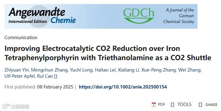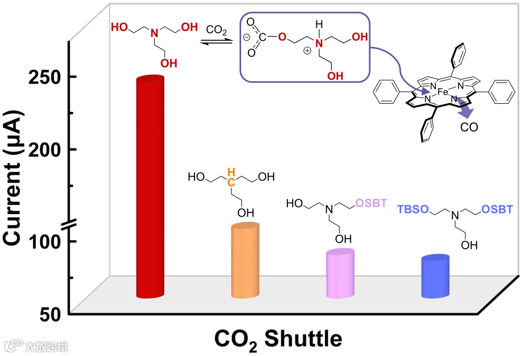 近日,陕西师范大学曹睿教授团队以FeTPP为催化剂,通过在反应体系中加入三乙醇胺,显著提升了电催化CO2RR效率,系统研究并阐明了三乙醇胺作为CO2 shuttle促进电催化CO2RR的作用机制。通过实验探究发现,三乙醇胺可以有效结合CO2分子,并且其独特的三脚架结构在结合并活化CO2过程中发挥了关键作用。结合理论计算结果,进一步证实了三乙醇胺是良好的CO2搬运工:三乙醇胺可以迅速与CO2结合并进一步在催化中心释放出CO2,从而有效提升催化剂周围CO2浓度;另一方面,三乙醇胺与CO2的结合产物碳酸氢酯具有更高的酸性,有利于作为质子源促进C−O键断裂,从而进一步提升了FeTPP电催化CO2RR的活性。
