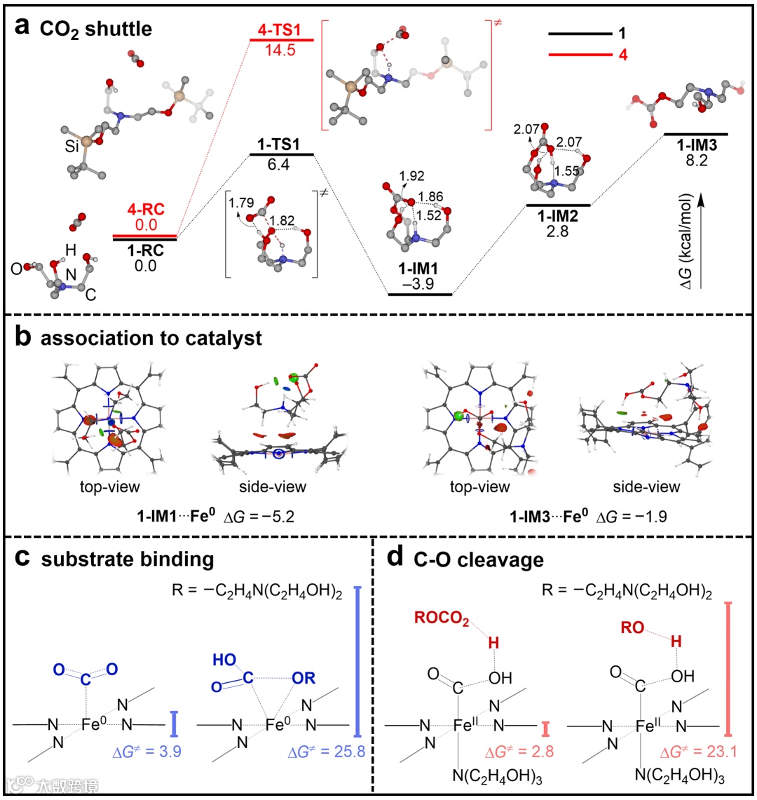 图5(a)1-CO2和4-CO2两性离子化合物分子内质子转移势能面图。(b)1-IM1···Fe0和1-IM3···Fe0之间的非共价吸引作用以及它们的结合能(kcal/mol)。(c)催化活性位点与底物结合的过渡态及其能垒。(d)不同质子源存在时C−O断键的能垒。