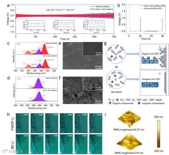 图5. (a) 在电流密度为1 mA cm−2、容量为1 mAh cm−2的情况下,两种电解质下Li||Li对称电池的循环性能。(b) 用Aurbach法测得的平均CE。(c) C 1s和(d) F 1s XPS光谱。(e) BE- FMOP和 (f) BE对称电池循环试验后的锂金属阳极表面SEM。(g) 锂阳极表面不同电解质的锂沉积和SEI。(h) 不同电解质原位沉积锂的光学图像(电流密度为1 mA cm−2)。(i) 不同电解质的AFM表面