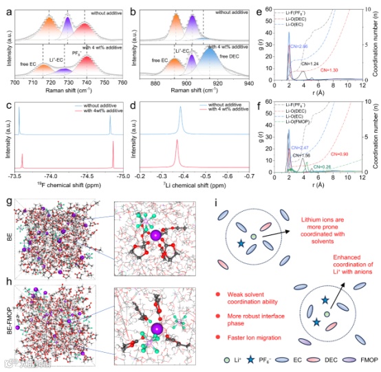 图3. (a,b) BE和BE-FMOP电解质的拉曼光谱。(c) 不同电解质体系的19F和 (d) 7Li NMR谱。(g,h) 25 °C时的MD快照。(e,f) 不同电解质体系的RDF(实线)和CN(虚线)。不同元素的颜色:黑- C、白- H、绿- F、红- O、深紫色- Li、浅紫色- P。(i) 不同电解质中Li+配位结构示意图