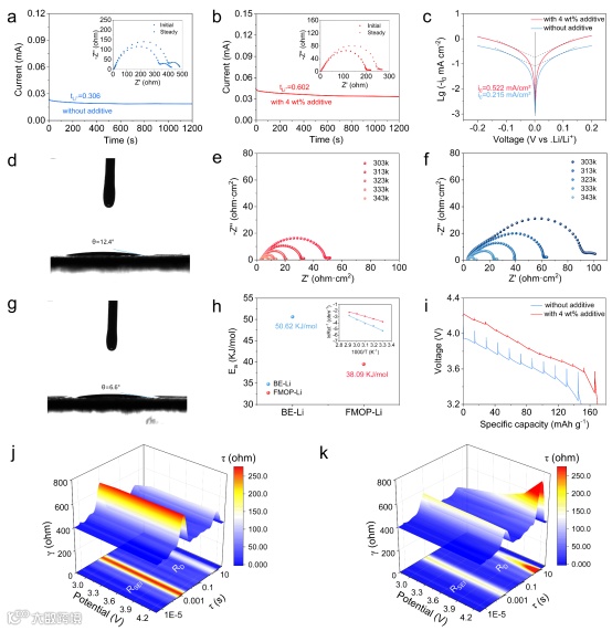 图4. (a,b) 未添加和添加4 wt%添加剂时锂对称电池的电流时间分布。如图所示为极化前后的电化学阻抗谱。(d) 无添加剂和 (g) 添加量为4 wt%时电解液液滴在锂箔表面的接触角。(c) 未添加和添加4 wt%添加剂的锂对称电池CV试验的拟合Tafel曲线。(e) 未添加添加剂的锂对称电池和 (f) 添加了4 wt%添加剂的锂对称电池在不同预循环温度下的EIS图。(h) 不同电解质的Ea。插图显示了阿伦尼乌斯的阻抗行为。(i) 不同电解质的GITT曲线。(j) BE电解质和 (k) BE- FMOP电解质的DRT三维等高线图