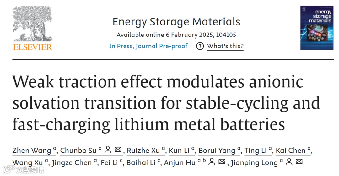 Zhen Wang, Chunbo Su, Ruizhe Xu, Kun Li, Borui Yang, Ting Li, Kai Chen, Wang Xu, Jingze Chen, Fei Li, Baihai Li, Anjun Hu, Jianping Long, Weak traction effect modulates anionic solvation transition for stable-cycling and fast-charging lithium metal batteries, Energy Storage Materials, 2025, 104105.