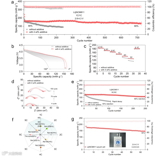图6.(a) Li||NCM811电池的电化学性能。(b) 添加和不添加FMOP的Li||NCM811电池在不同循环下的电压分布。(c) Li||NCM811电池的倍率性能。(d) Li||NCM811电池不同循环后的EIS。(e) Li||NCM811电池在5 C下的循环性能。(f) 与之前报道的NCM811阴极的快速充电性能比较。(g) 使用BE-FMOP电解质在2.8 ~ 4.3 V下的Li||NCM811袋状电池的循环性能。