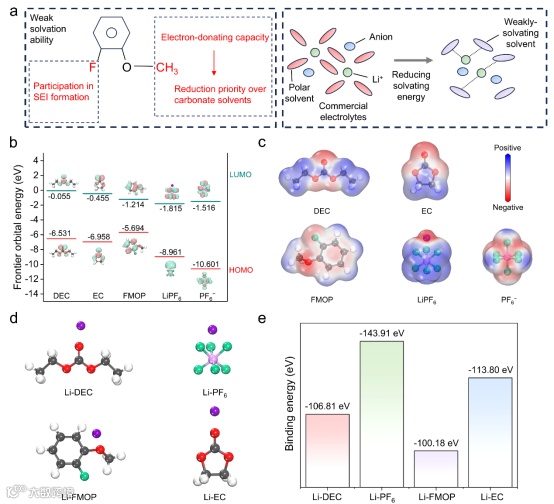 图2. (a) 引入FMOP溶剂后的溶剂化结构转变示意图。(b) DEC、EC、FMOP、LiPF6和PF6−的HOMO和LUMO。(c) 静电势表面,红色和蓝色区域分别代表负电荷和正电荷。(d) Li+与DEC、PF6−、FMOP和EC的结合能。不同元素的颜色:黑色-C、白色-H、绿色-F、红色-O、深紫色-Li、浅紫色-P。(e) 相应结合能值的比较