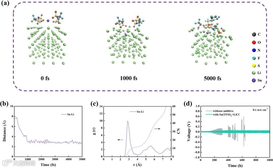 图5 AIMD模拟前后(a)模型的变化及(b)Sn-Li间距的变化;(c)Sn周围Li的RDF;(d)含/不含的电解液添加剂时Li-Li对称电池的循环性能