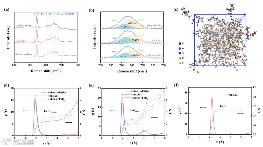 图2(a-b)含/不含20 mM LiCl或Sn(TFSI)2添加剂的LiTFSI/TEGDME 电解液的Raman 光谱;(c)MD 模拟的LiTFSI/TEGDME 电解液模型;(d-e)含/不含LiCl 或Sn(TFSI)2添加剂时Li+周围TEGDME 和TFSI−中O 原子的RDF;(d)LiCl 添加剂下Li+周围Cl−离子的RDF