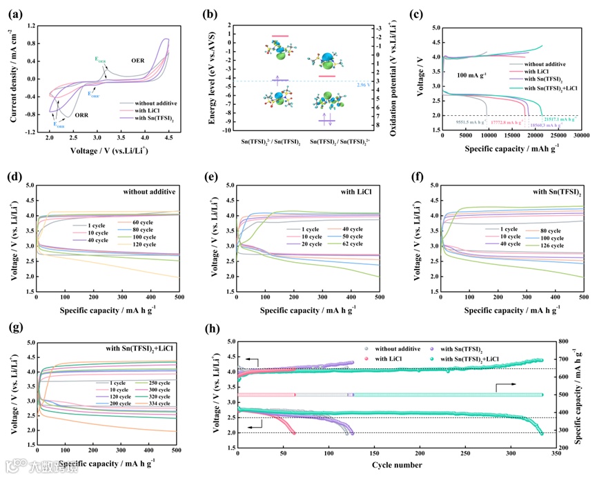 图3(a)含/不含LiCl 或Sn(TFSI)2添加剂时的CV 曲线;(b)Sn(TFSI)2的分子轨道能级和相应的氧化电位;(c-g)基于单纯的LiTFSI/TEGDME 电解液,以及含LiCl 和Sn(TFSI)2添加剂的电解液的LOBs的全放电/充电曲线和循环性能;(h)不同电解液添加剂的LOBs 的截止电压与循环次数的关系