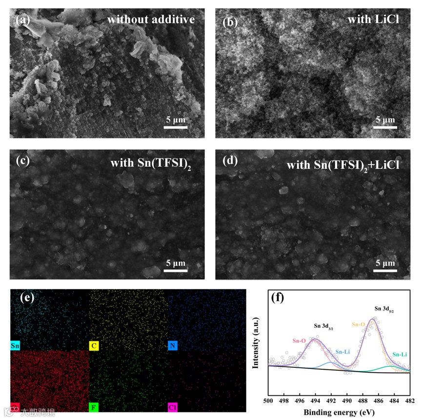 图4(a-d)含/不含LiCl 或Sn(TFSI)2 添加剂时LOBs 循环工作40 次后负极锂片的SEM 图;(e)基于Sn(TFSI)2+LiCl 电解液添加剂的LOBs 循环40 次后负极锂片的元素mapping 和(f)XPS图