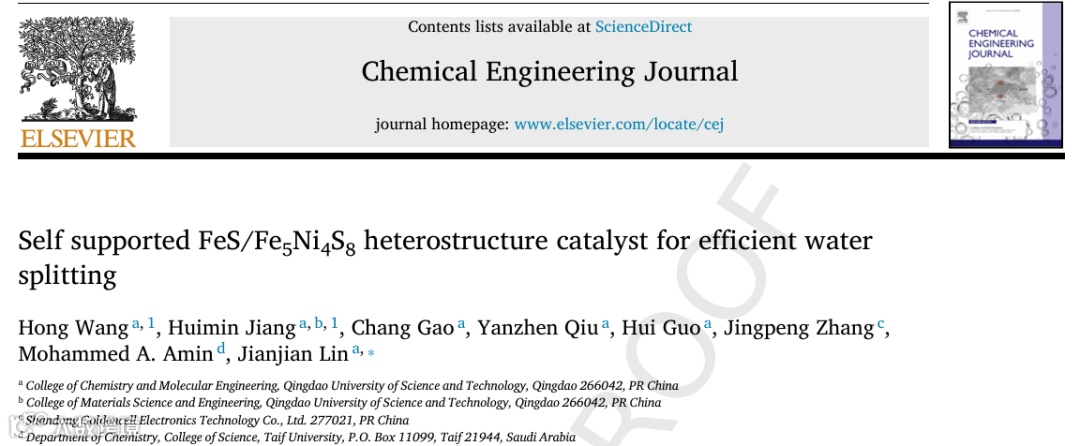 近日,青岛科技大学林健健教授,在国际知名期刊Chemical Engineering Journal上发表题为“Self Supported FeS/Fe5Ni4S8 Heterostructure Catalyst for Efficient Water Splitting”的观点文章,通过一步溶剂热法实现了 FeS/Fe5Ni4S8异质结构催化剂在泡沫铁表面的原位生长。利用NiFe 与异质界面的快速电子转移动力学之间独特的协同作用共同增强了 FeS/Fe5Ni4S8异质结构催化剂的性能。这项工作不仅拓宽了 NiFe 基催化剂的研究范围,也为异质结构催化剂在电解水中的应用提供了新的见解和方法。