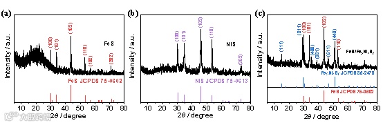 图3(a)FeS的XRD图谱,(b)NiS的XRD图谱,(c)FeS/Fe5Ni4S8的XRD图谱。