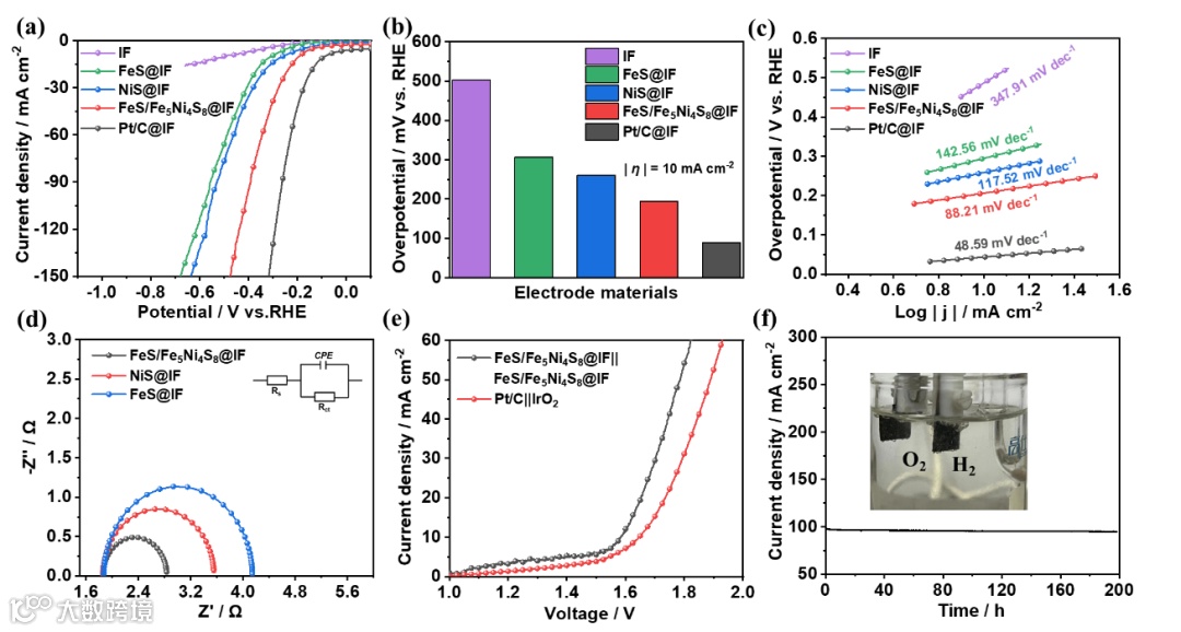 图6.(a)催化剂的HER极化曲线数据。(b)在电流密度为10 mA cm-2时催化剂的过电位,(c)催化剂的Tafel斜率,(d)奈奎斯特曲线图,(e)FeS/Fe5Ni4S8@IF全水解性能极化曲线,(f)FeS/Fe5Ni4S8@IF 200 h 全水解稳定性测试曲线。
