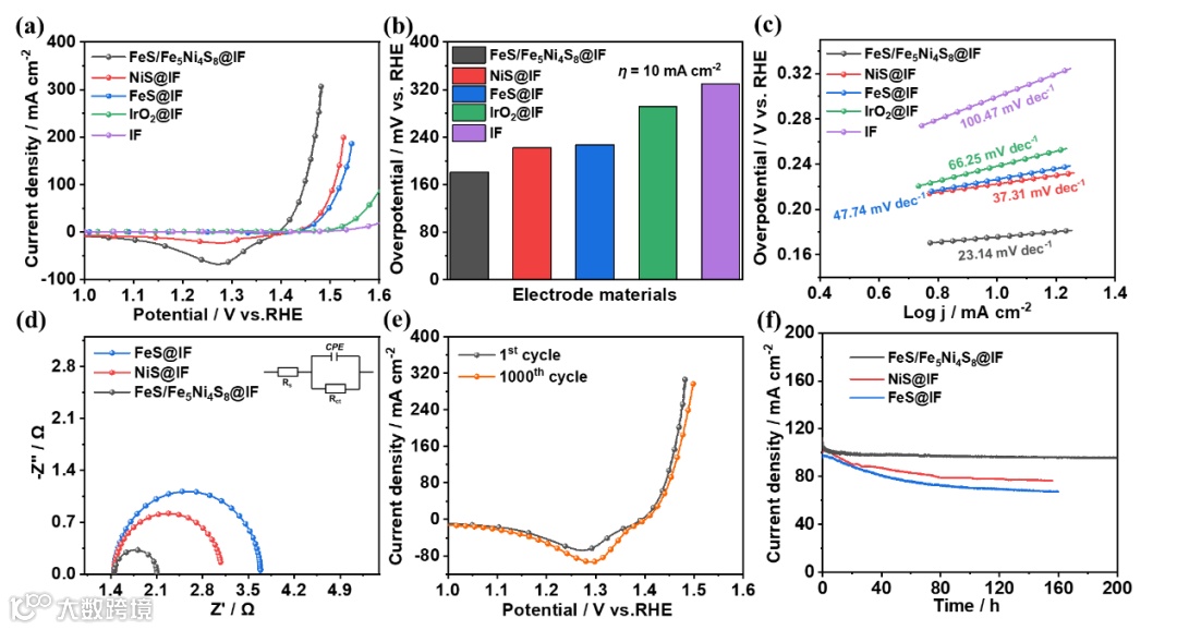 图5. 催化剂的电化学测试数据,(a)催化剂OER极化曲线数据,(b)在电流密度为10 mA cm-2时催化剂的过电位,(c)催化剂的Tafel斜率,(d)奈奎斯特曲线图,(e)1000次循环伏安测试前后FeS/Fe5Ni4S8@IF性能对比,(f)催化剂200h稳定性测试曲线。