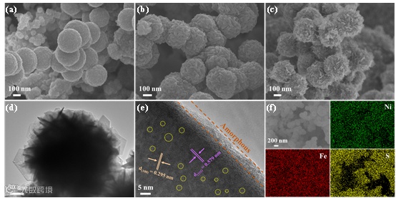 图2. 对FeS/Fe5Ni4S8催化剂进行的结构表征。反应时间为(a)12 h,( b)18 h,(c)24 h的SEM图像,(d)TEM图像,(e)HRTEM图像,(f)元素映射图谱。
