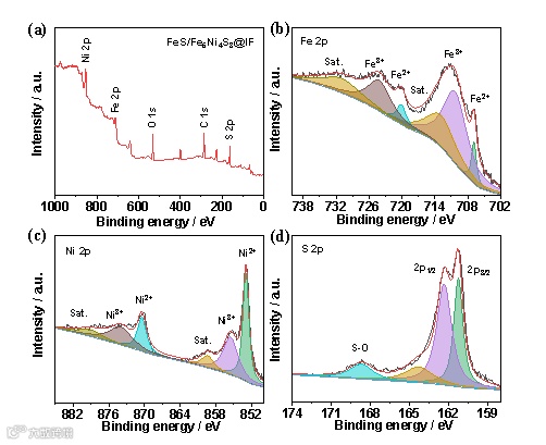 图4.对FeS/Fe5Ni4S8催化剂进行的XPS测试。(a)全谱,(b)Fe 2p高分辨光谱,(c)Ni 2p高分辨光谱,(d)S 2p高分辨光谱