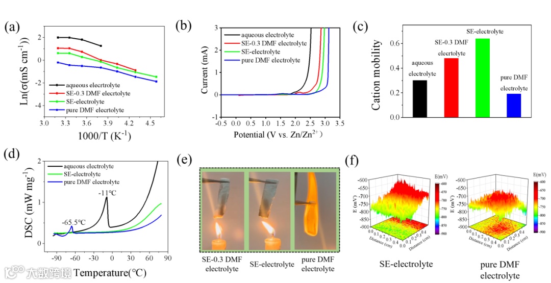 图2 (a)不同温度下的离子电导率。不同电解质的(b)电化学窗口,(c)阳离子迁移率,(d)温度稳定性,(e)可燃性。(f)锌箔在SE-electrolyte和纯DMF电解液中浸泡144h后的SKP结果。