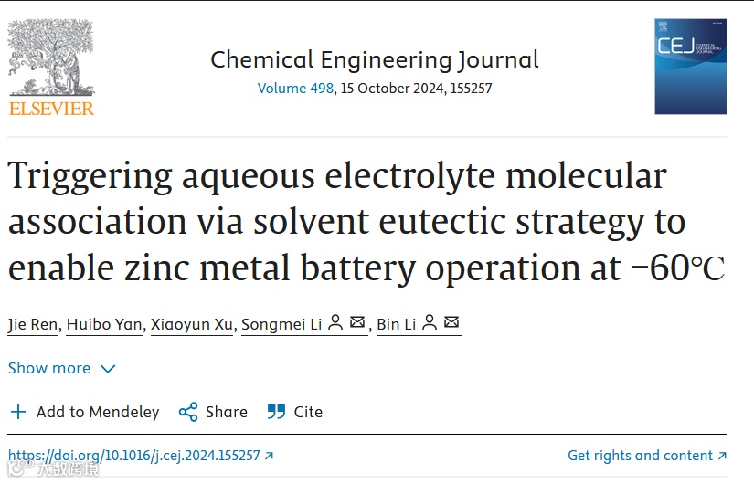 水系锌金属电池(AZMB)具有理论能量密度高、成本低、安全性高等优点,是下一代电化学储能系统最有前途的选择之一。在常用的水溶液电解质中,锌离子以水合锌离子(Zn(H2O)62+)的形式存在。在电池循环过程中,Zn(H2O)62+脱溶过程产生水分子,这些水分子集中在电极表面,引发电极界面上的副反应。这些副反应阻碍了Zn2+的转移,降低了Zn/Zn2+的可逆性,加剧了Zn枝晶的形成,极大地限制了锌电池的使用寿命。此外,锌电池的应用场景正在逐步向低温扩展,这对水性锌电池的低温性能提出了新的要求。传统的水性电解质在0℃以下转变为固态,导致离子扩散动力学缓慢、电导率下降等问题,限制了锌离子电池在低温环境下的正常工作。