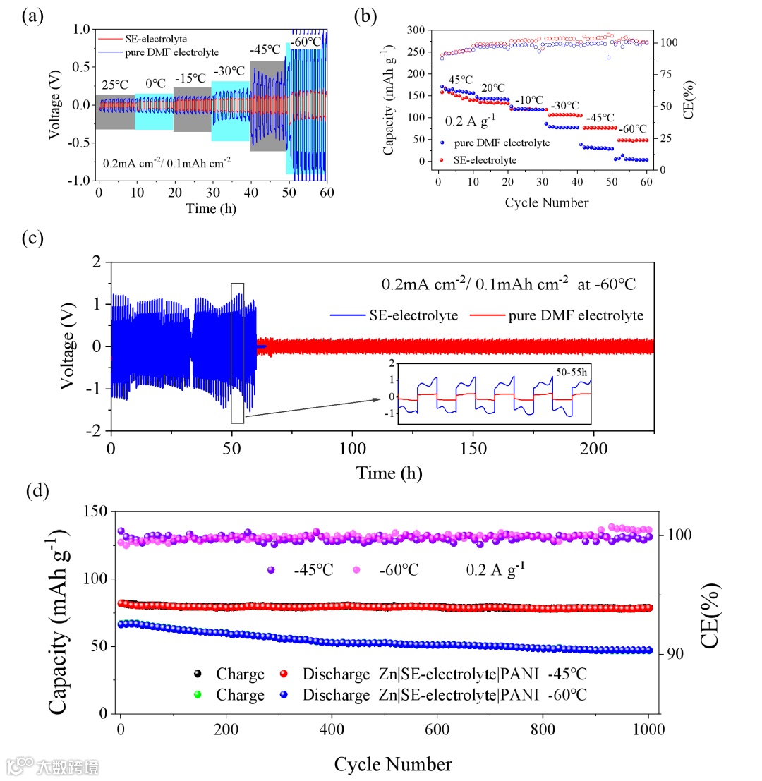 要点三:溶剂共晶电解质(SE-electrolyte)实现锌金属电池在−60℃下稳定工作