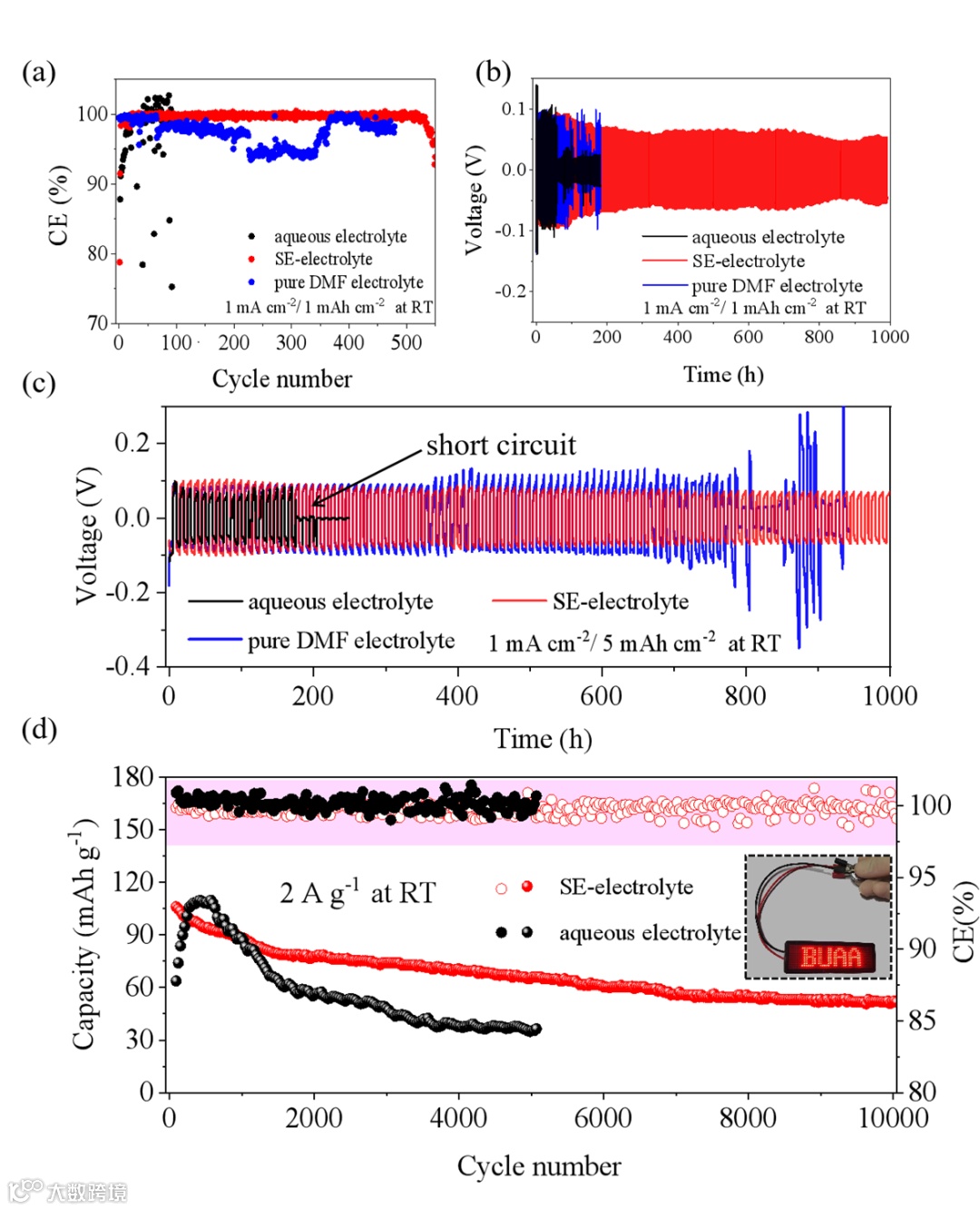 为了进一步揭示SE-electrolyte的优势,分别在室温和低温条件下进行了Zn||Cu半电池、Zn||Zn对称电池和Zn||PANI全电池的性能测试。室温(25℃)下,500次循环后,Zn|SE-electrolyte|Cu半电池能保持99.32%的库伦效率。在1mA cm-2/5mAh cm-2的高容量密度下,Zn|SE-electrolyte|Zn对称电池可以稳定循环超过1000小时,Zn|SE-electrolyte|PANI全电池在10000次循环后能保持99.79的库伦效率。-60℃的极端低温条件下,Zn|SE-electrolyte|PANI全电池能稳定循环超过1000次,库伦效率为99.88%,循环后可以保持50mAh/g的容量。这些结果表明,SE-electrolyte显著提高了AZMB的低温性能,扩大了其工作的温度范围。