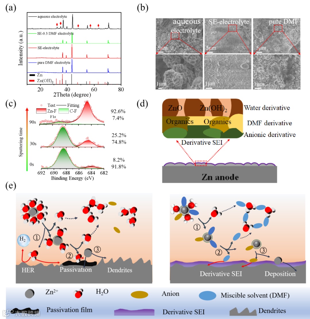 SE-electrolyte具有优异的低温性能,在−100 ~ 80℃的宽温度范围内不发生固液相变,在−55℃的低温下依旧有0.230mS cm-1的离子电导率。此外,SE-electrolyte还具有活化能低(Ea =12.8kJ/mol)、电化学工作窗口宽(2.84V vs Zn/Zn2+)、阳离子迁移率高(0.64)等特性。在SE-electrolyte中循环的锌阳极表面无明显锌枝晶生成,电极表面SEI层主要为ZnF2和ZnS。结果表明,DMF通过改变Zn2+溶剂鞘结构,使Zn(H2O)x(DMF)5-x(anion)在脱溶剂化过程中释放更少的游离水分子,减少副反应的发生,而其释放的DMF和OTf-在电极表面附近分解形成稳定的SEI沉积层,诱导锌离子均匀沉积,提高锌阳极的使用寿命和循环稳定性。