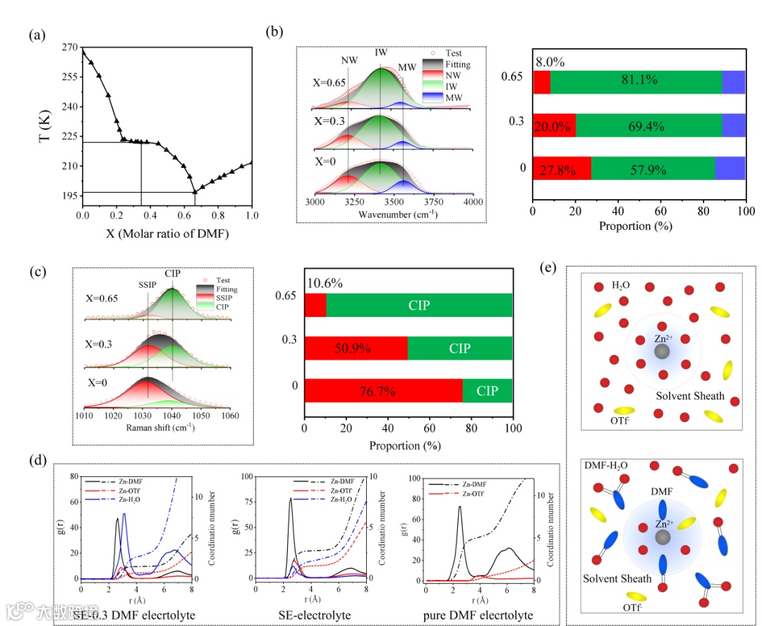 图1(a) DMF-H2O二元相图。不同电解质中(b)水分子状态和(c)锌离子溶剂鞘组成的比较。(d)分子动力学模拟。(e)传统水溶液电解质和硒电解质中锌离子溶剂鞘结构。