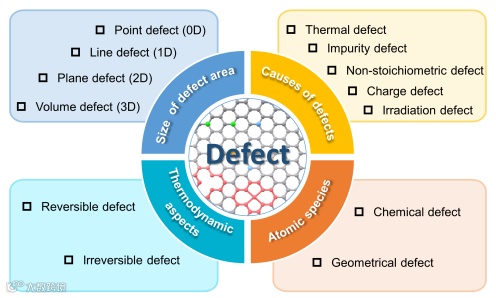 按照不同的分类标准可将缺陷分为不同的类型,例如以缺陷相对于固体催化剂面积大小为分类依据,可将缺陷分为点缺陷,线缺陷,面缺陷和体缺陷;按照缺陷的产生原因,可将其分为热缺陷,电荷缺陷、辐射缺陷等;按照热力学方面,可将其分为可逆缺陷和不可逆缺陷;按照原子种类,可将其分为化学缺陷和几何缺陷等。