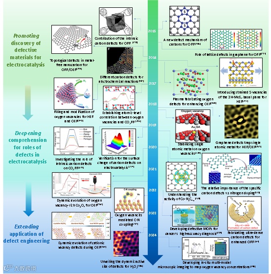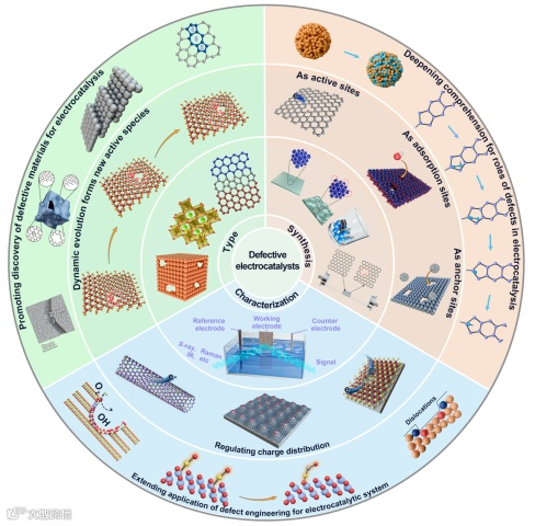 缺陷通过改变活性中心的电子和几何结构等来调控催化剂与中间体的结合能,进而改变反应能垒和提升性能。本综述主要总结缺陷对催化剂的三大影响,即调控活性位点的电荷分布、缺陷本身作为活化/吸附/锚定位点、缺陷的动态演变生成新的活性物种,从这三大方面深入探讨了缺陷与电催化性能的内在联系。
