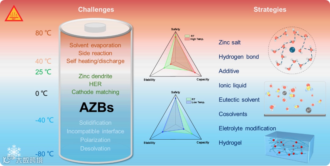 图1. 高低温下水系锌电池运行的挑战与解决策略